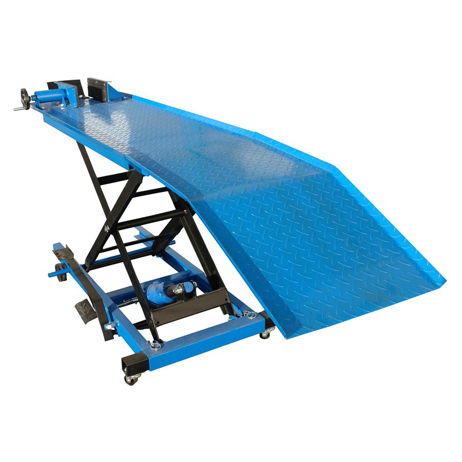 Hydraulická zvedací plošina, určená ke zdvihání motocyklů v prostředí garáží, domácích/servisních dílen apod. (→ maximální nosnost: 360 kg).
