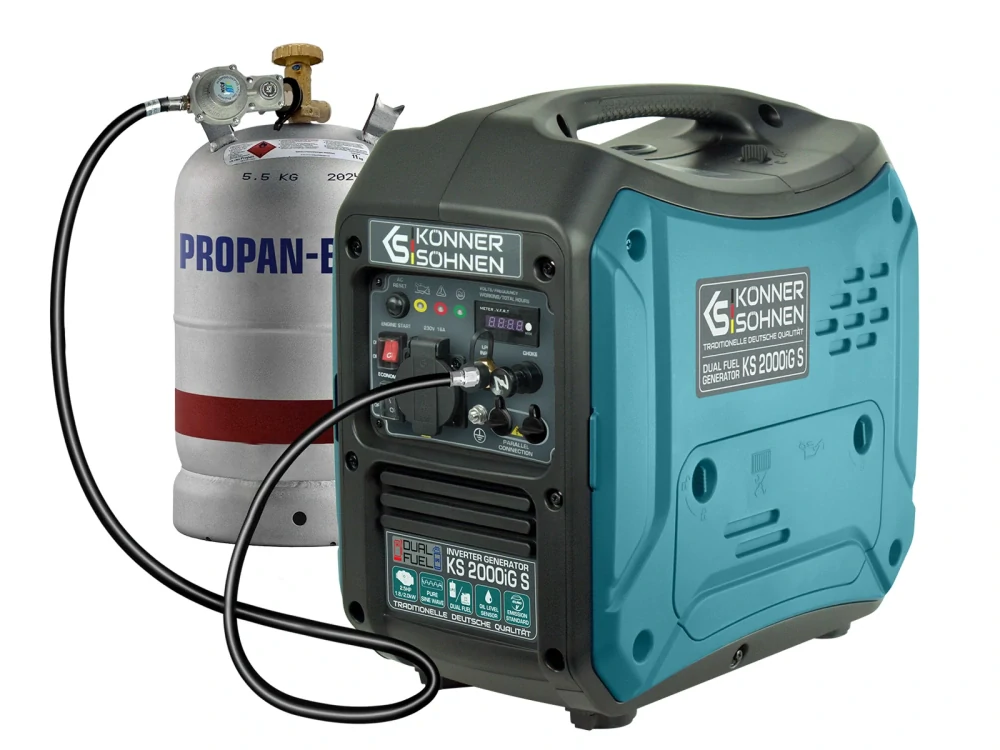 Invertorová elektrocentrála na plyn a benzín Könner & Söhnen KS 2000iG S německé značky Könner & Söhnen je pohodlný, kompaktní, téměř tichý zdroj elektrické energie. Klíčovou vlastností tohoto modelu je, že produkuje elektrický proud se správnou sinusovou vlnou.